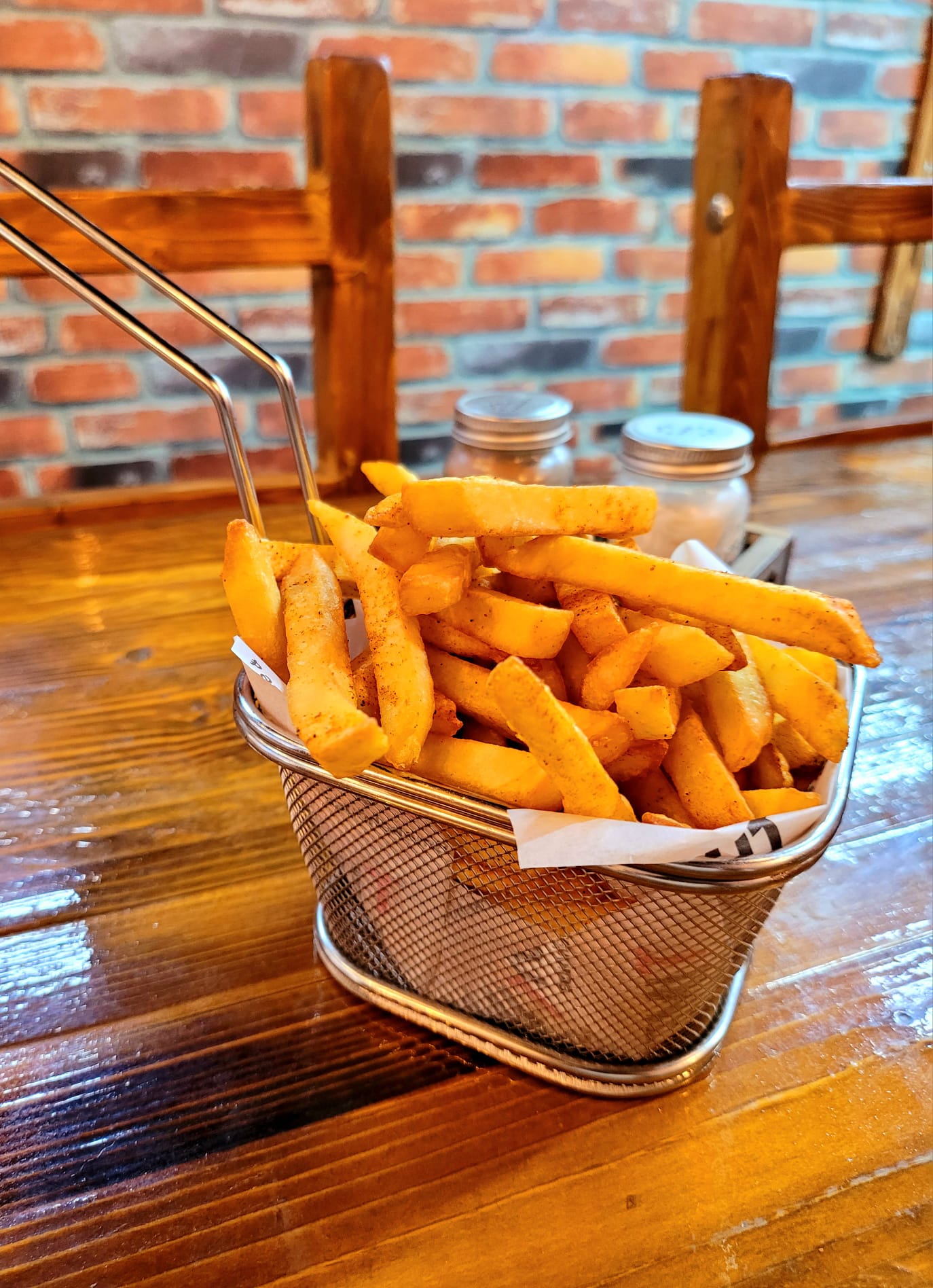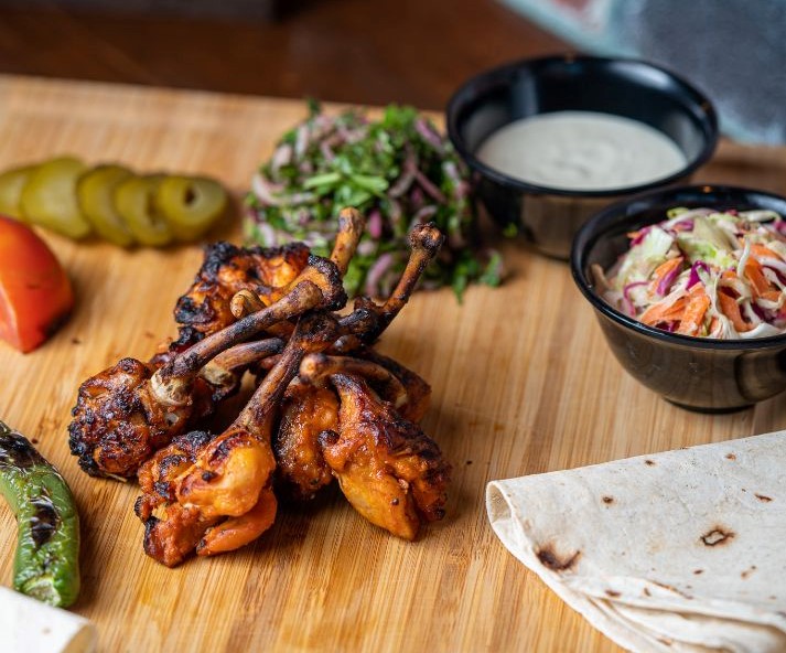 صحن جوانح ( سبايسي) ( بقدونس والبصل - فلفل أخضر مشوي - بطاطا مقلية بالبهارات الكايجون - كول سلو - مخلل - خيارات متنوعة من الصلصات وخبز باربيكيو)