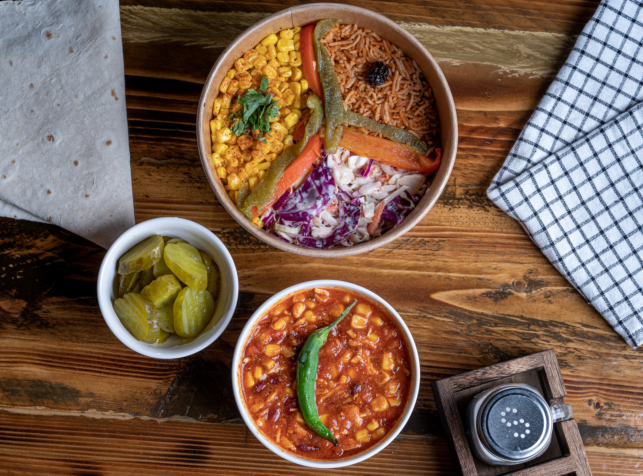 جاط بيف تشيلي (400 جرام ) لحم مفروم بصوص التشيلي مع (ذرة مع بهارات كايجون - فلفل مشوي - أرز مدخن وكول سلو - بقدونس - خبز باربيكيو يقدم على الجانب)