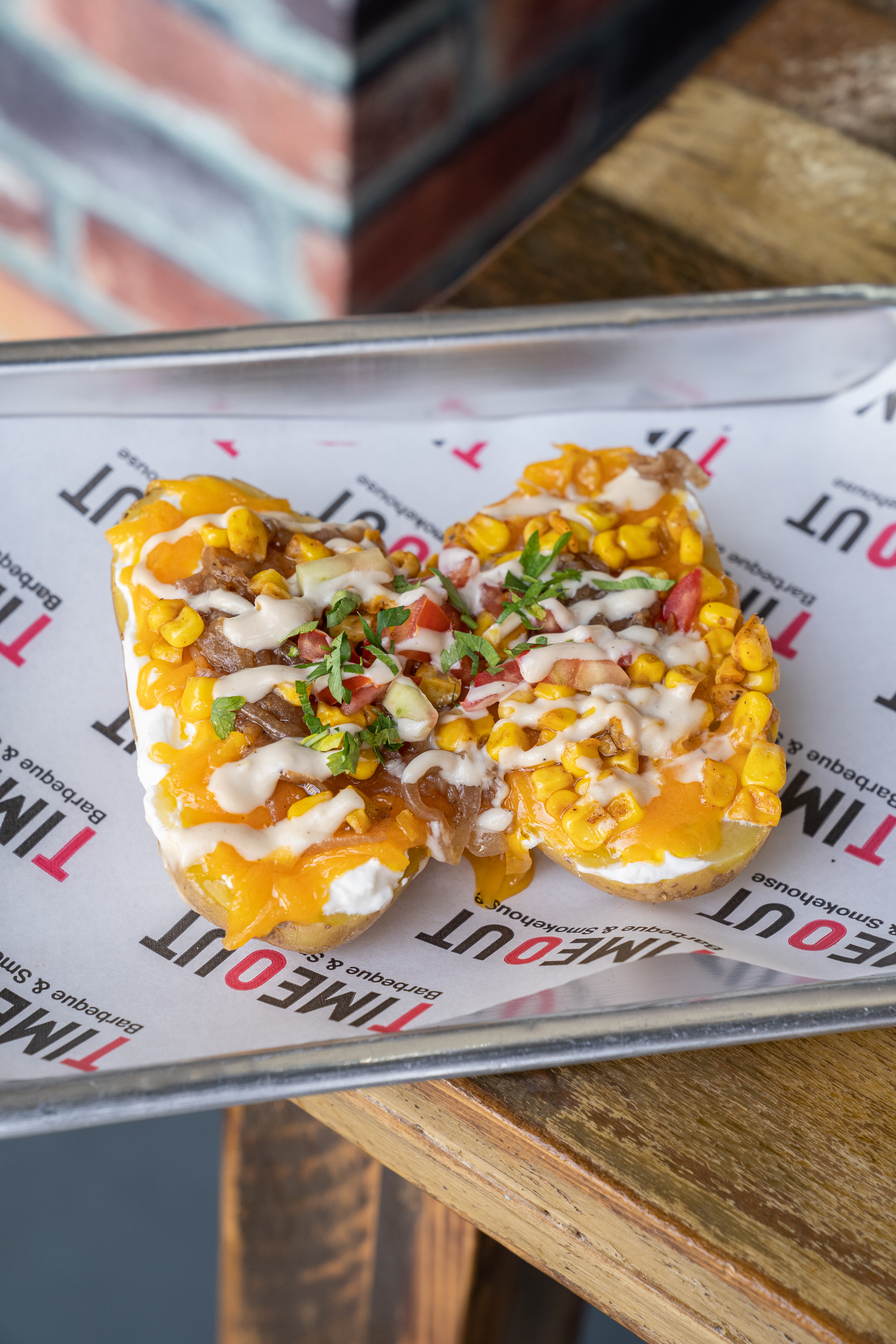جاط خروف مسحب - شرائح لحم غنم طرية مع (ذرة مع بهارات كايجون - فلفل مشوي - أرز مدخن وكول سلو - بقدونس - خبز باربيكيو يقدم على الجانب)