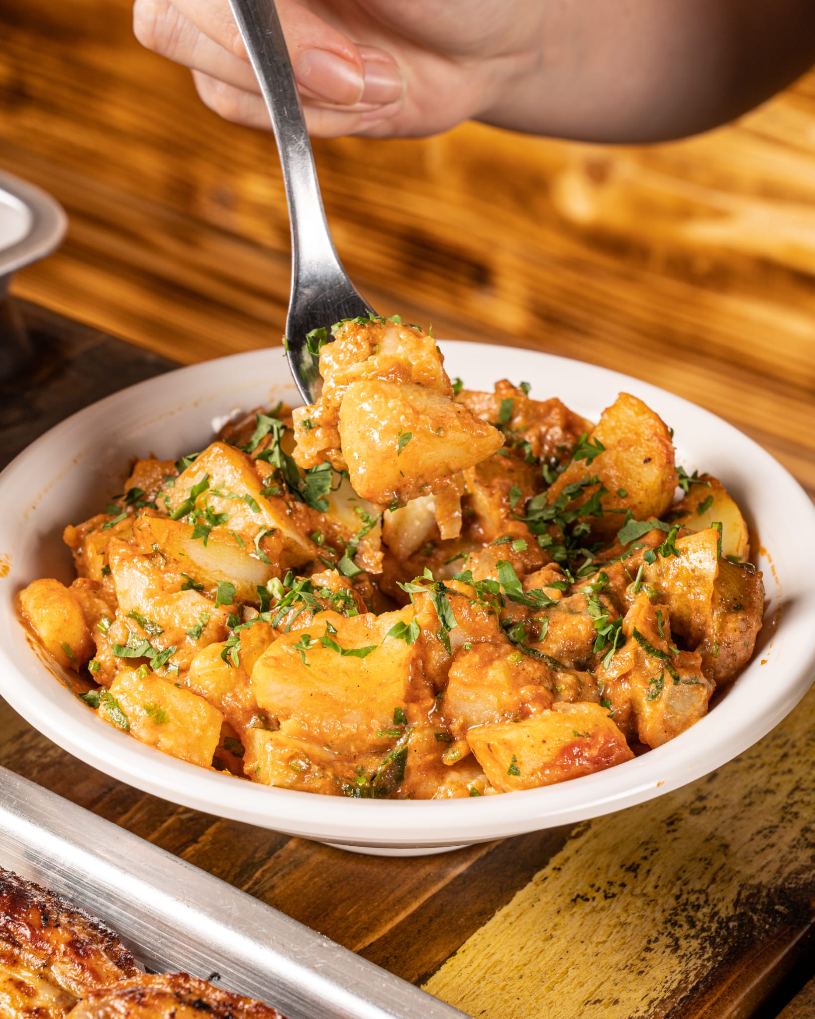 دجاج كامل مسحب (بصل والبقدونس - فلفل أخضر مشوي - رز مدخن - بطاطا مقلية بالبهارات الكايجون - خيارات متنوعة من الصلصات وخبز باربيكيو)