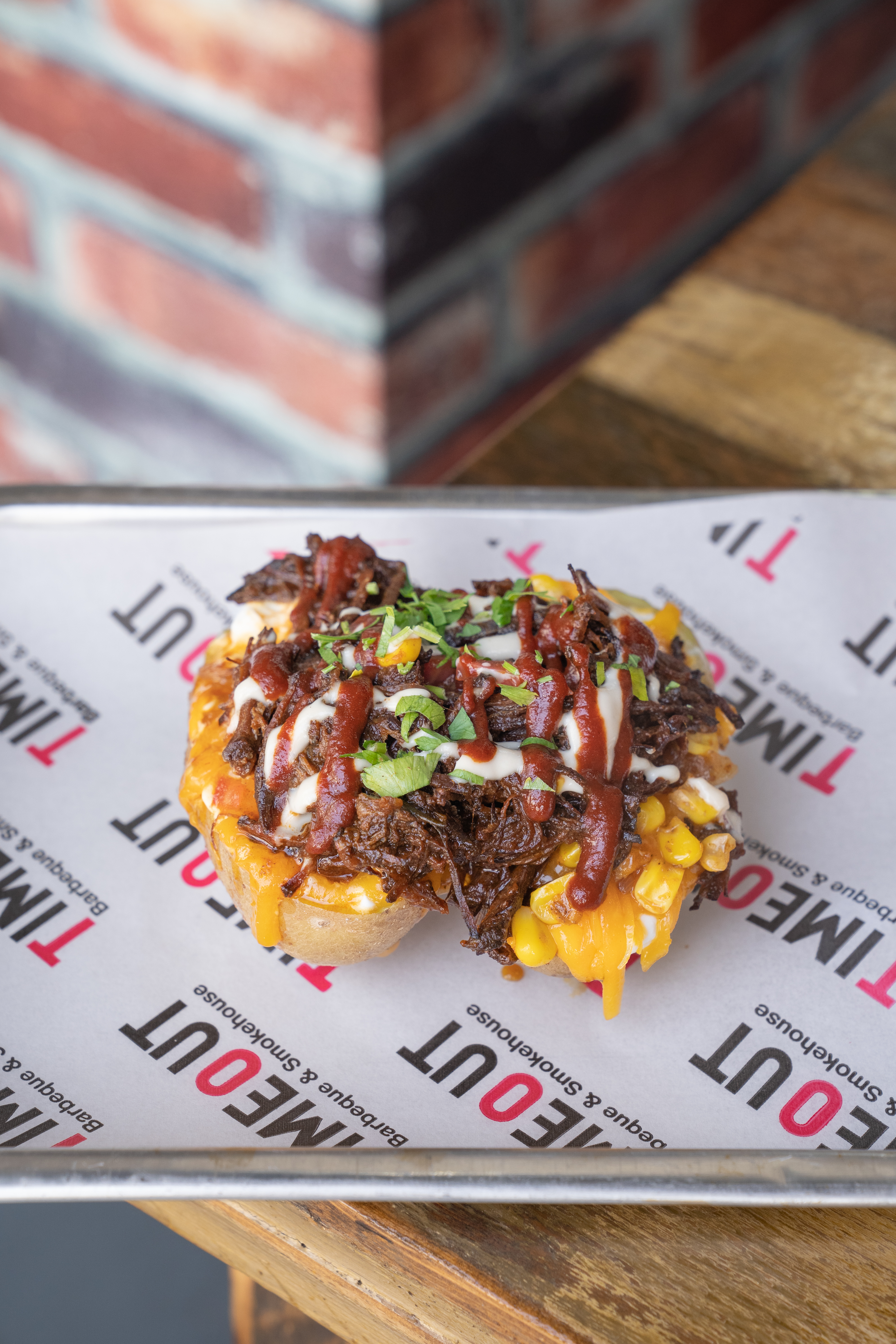 جاط بريسكت مسحب - شرائح لحم بريسكت مسحب مع (ذرة مع بهارات كايجون - فلفل مشوي - أرز مدخن وكول سلو - بقدونس - خبز باربيكيو يقدم على الجانب)