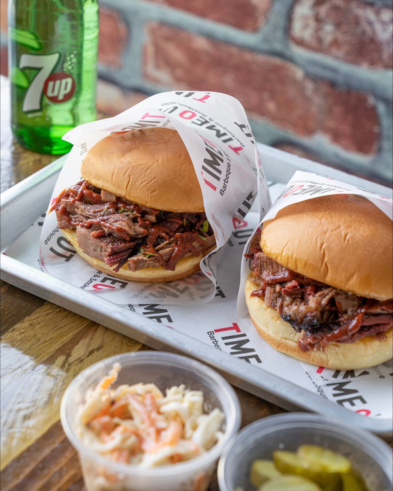 سلايدرز بريسكت مدخن × 2 (شرائح بريسكت لحم بقري مدخن - صوص الباربيكيو مع خبز البطاطس) يأتي مع مخلل وسلطة كول سلو على الجانب