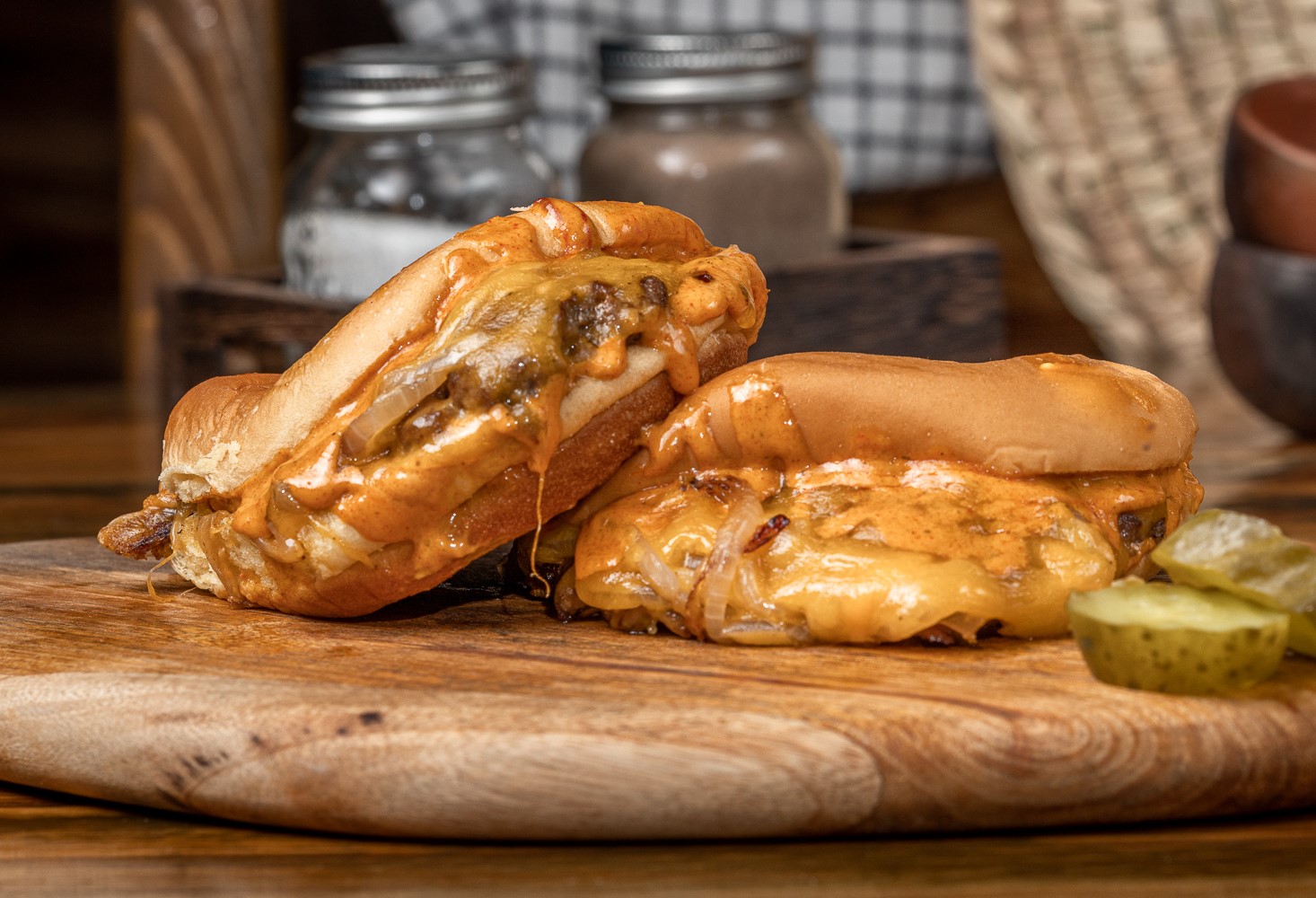 سلايدرز تشيز برجر × 2 ( بصل معسل - جبنة مع خبز البطاطس) يأتي مع مخلل وسلطة كول سلو على الجانب