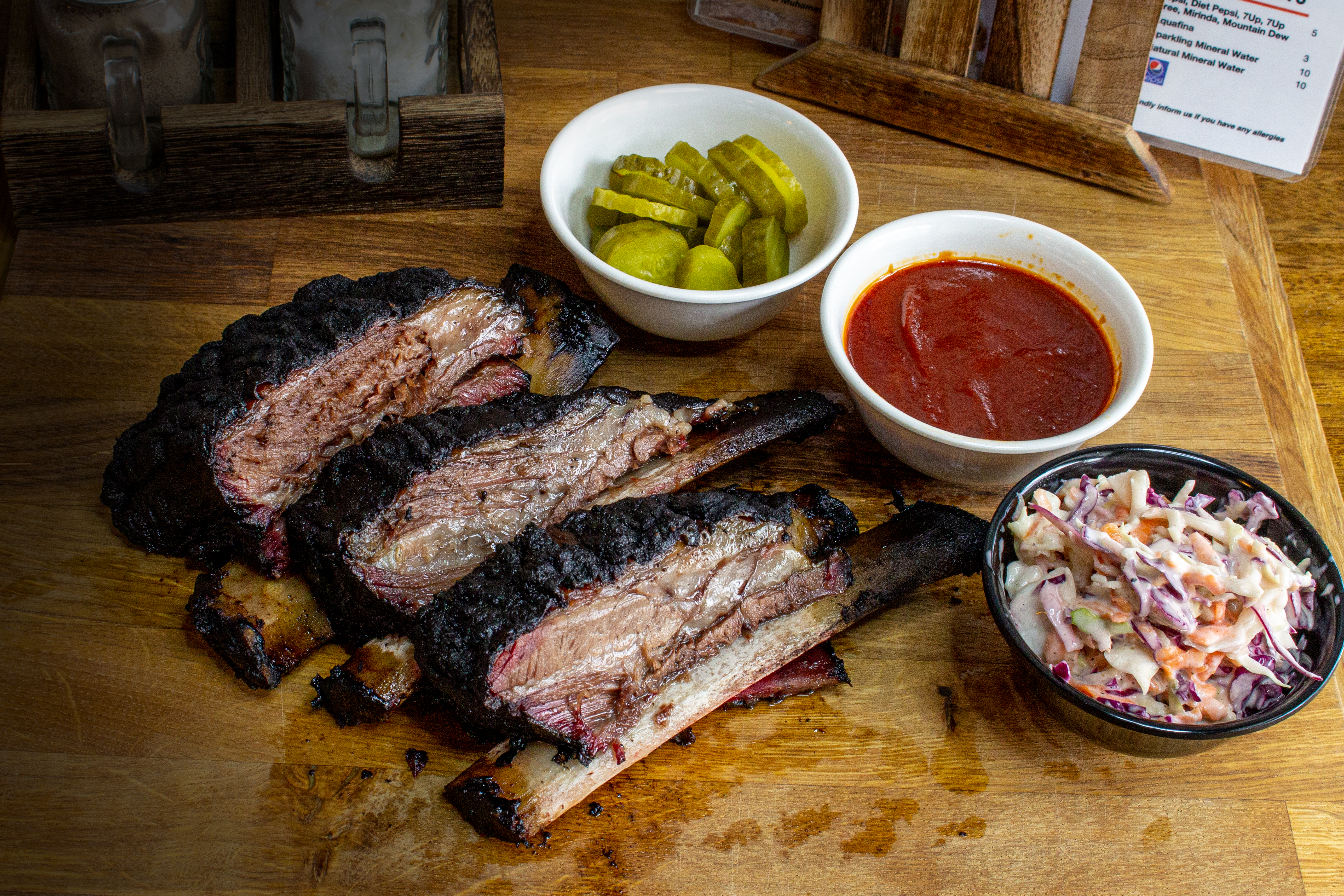 لحم بريسكت مدخن 12 ساعة تكساس ستايل (بريسكت كامل) + 3 أطباق جانبية للاختيار - (مخلل - كول سلو و صوص باربيكيو على الجانب)