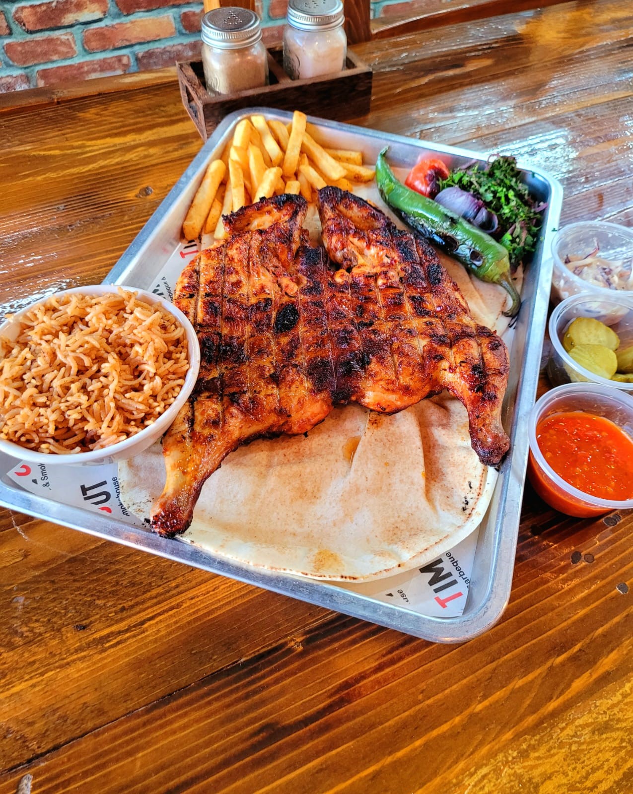 نصف دجاج مشوي ماكينة (بصل والبقدونس - فلفل أخضر مشوي - رز مدخن - بطاطا مقلية بالبهارات الكايجون - خيارات متنوعة من الصلصات وخبز باربيكيو)