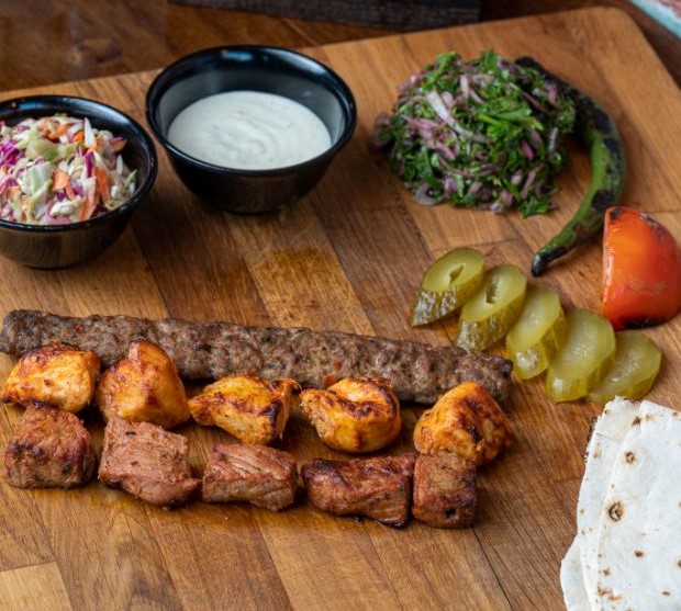صحن كفتة لحم (بقدونس والبصل - فلفل أخضر مشوي - بطاطا مقلية بالبهارات الكايجون - كول سلو - مخلل - خيارات متنوعة من الصلصات وخبز باربيكيو)