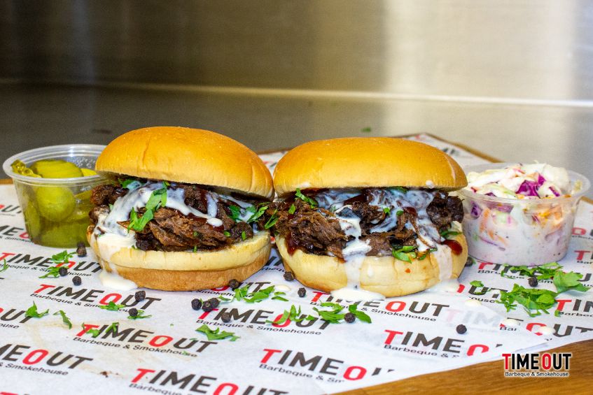 سلايدرز بريسكت مدخن × 2 (شرائح بريسكت لحم بقري مدخن - صوص الباربيكيو مع خبز البطاطس) يأتي مع مخلل وسلطة كول سلو على الجانب