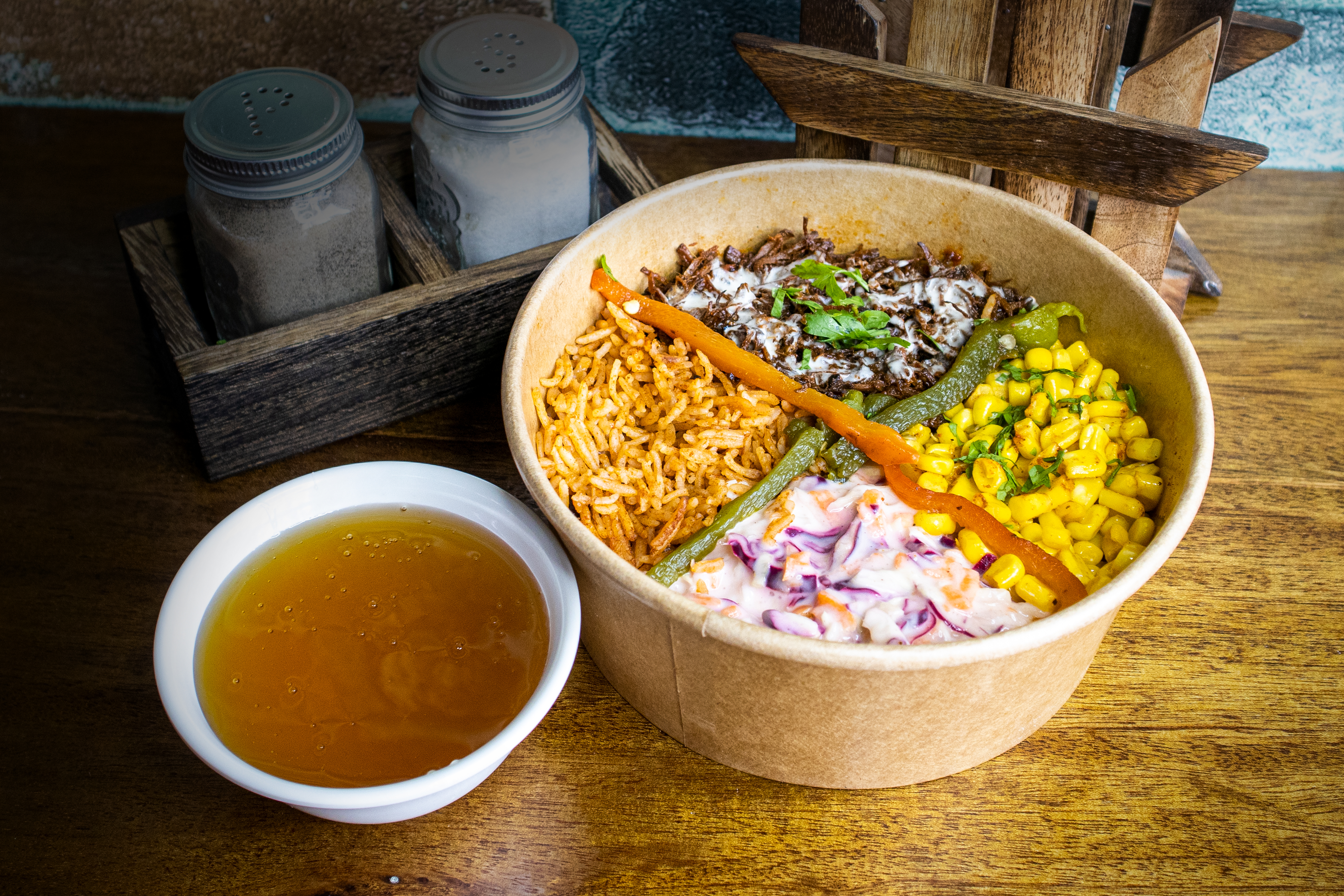 جاط بريسكت مسحب - شرائح لحم بريسكت مسحب مع (ذرة مع بهارات كايجون - فلفل مشوي - أرز مدخن وكول سلو - بقدونس - خبز باربيكيو يقدم على الجانب)